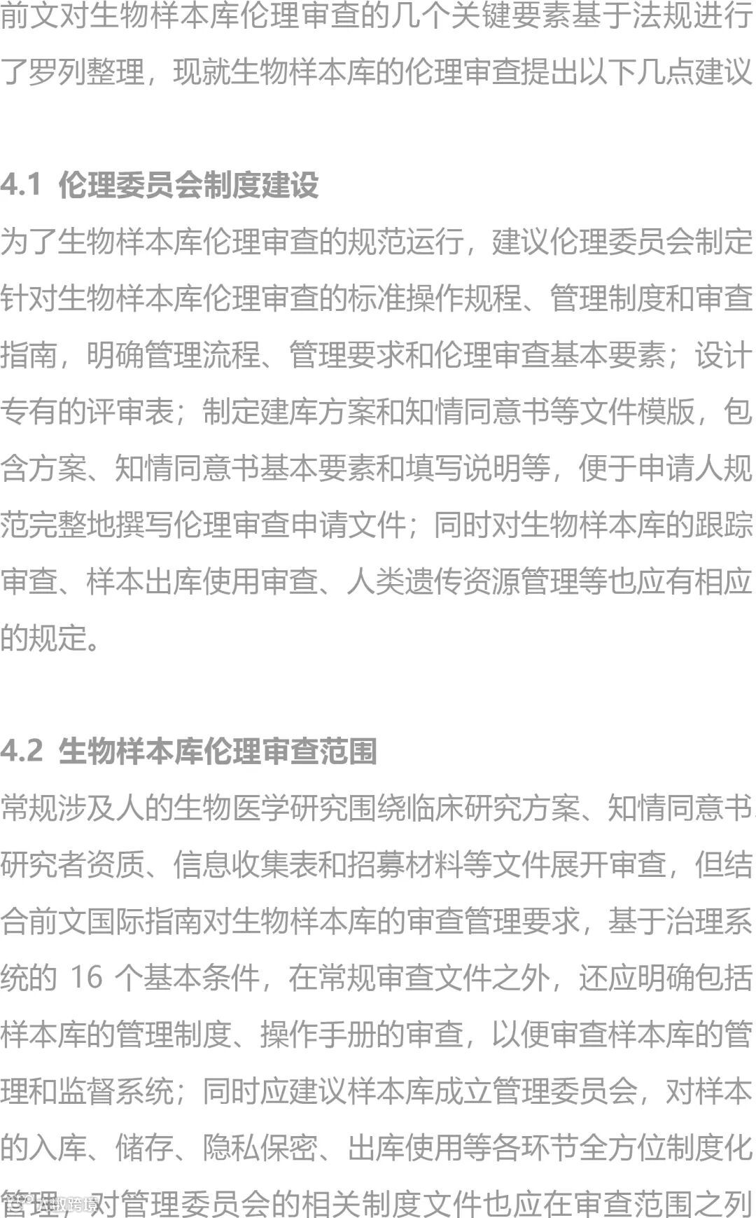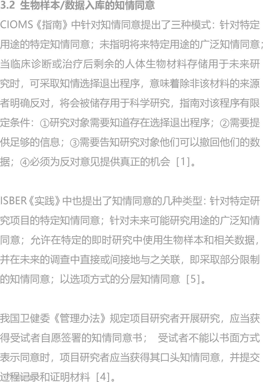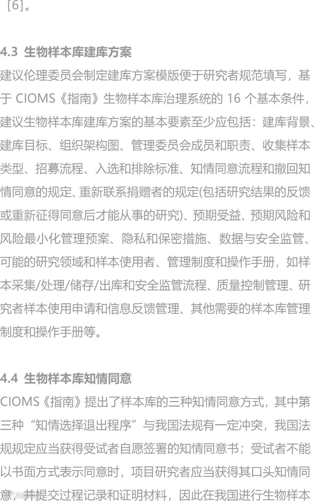 “ 随着近年来生物医学的迅猛发展和转化医学、精准医学概念的不断深入,生物样本库建设越来越受到广泛关注和投入。涉及人体的生物材料包括:组织、器官、血液、血浆、皮肤、血清、DNA、RNA、蛋白质、细胞、毛发、指甲、尿液、唾液或其他体液等,相关人员出于研究或医学或诊断目的收集上述材料[1],有些材料在收集时不知道确切的研究项目和具体用途,于是组建生物样本库,将生物样本/数据通过一定的技术手段进行储存,期望能用于将来的研究。《赫尔辛基宣言》第一条即写明:作为对涉及人体受试者的医学研究的伦理原则的一项声明,此研究还包括对可识别身份的人体材料和数据进行的研究[2],因此生物样本库的建库必须获得伦理委员会审查批准。”