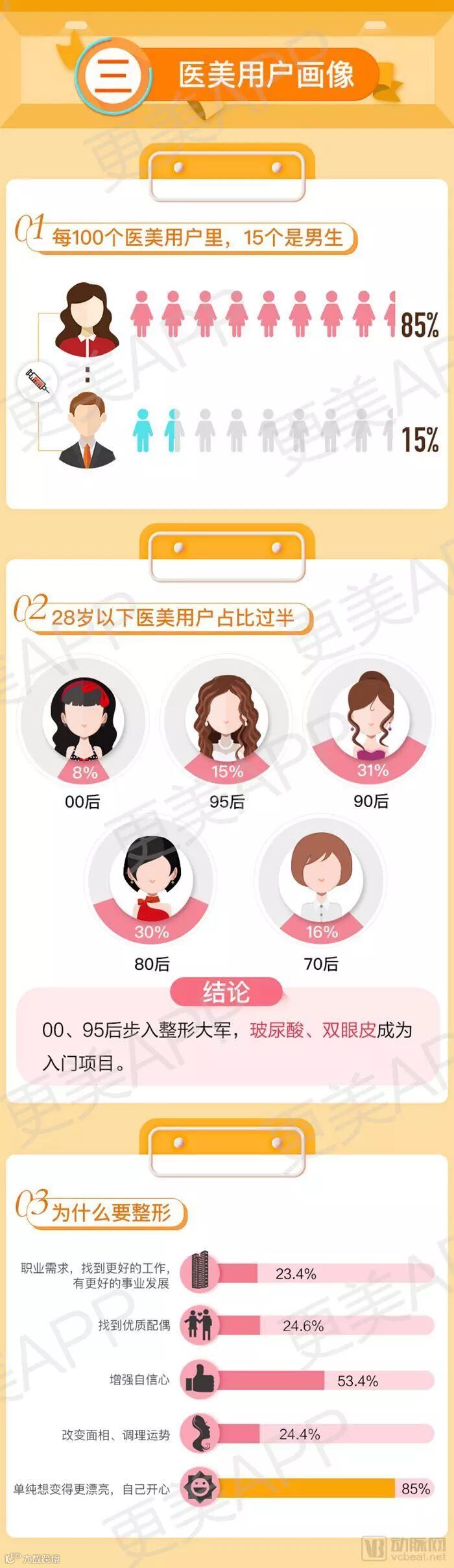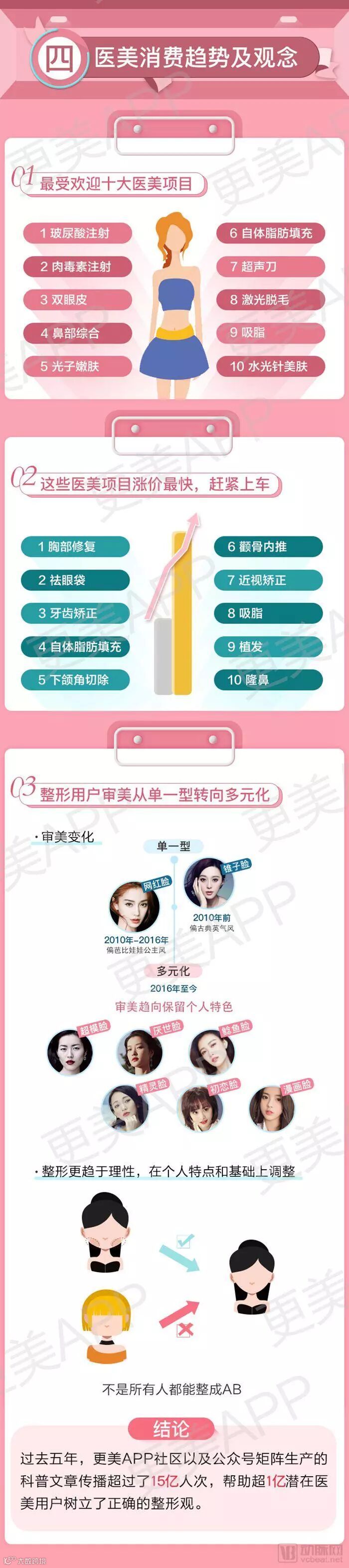 从2013成立至今的五年,更美APP社区以及公众号矩阵持续生产医美科普文章,相关医美科普文章累积传播了15亿人次,帮助超1亿潜在医美用户树立了正确的价值观。95后作为在这一阶段进入医美市场的整形“新一代”,整形意识更加成熟科学。