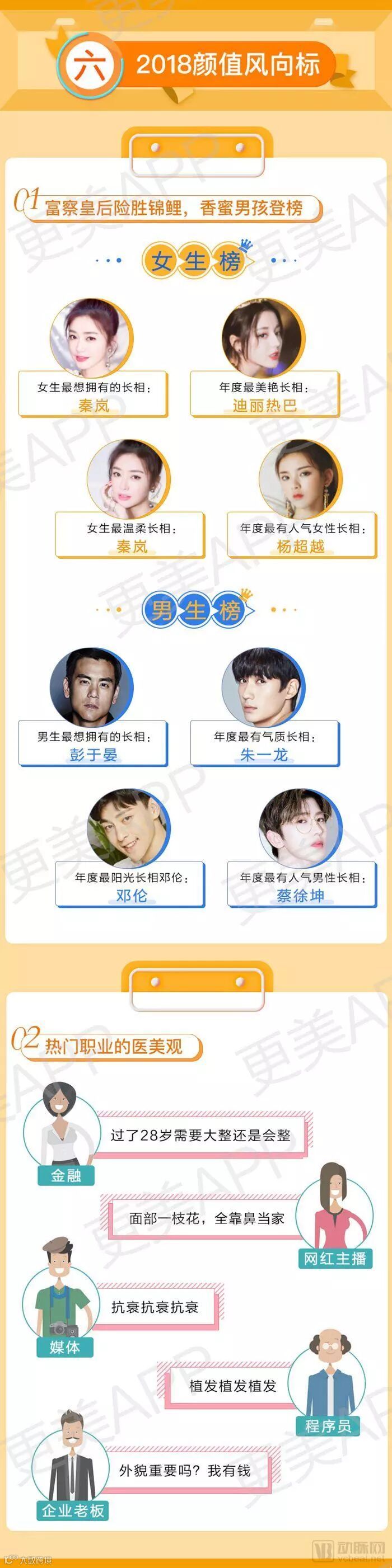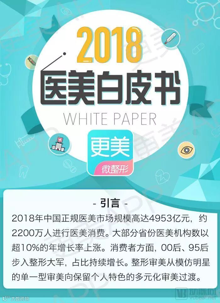 2018年12月20日,国内头部的医疗美容与健康服务平台更美APP发布了《2018中国医美行业白皮书》。这是更美第四年发布医美行业白皮书。该报告根据后台3600万用户、电商大数据及8000多家医美机构的数据调研制作,描绘了2018年中国医美行业现状,总结了最新的医美消费趋势:2018年中国正规医美市场规模高达4953亿元,大部分省份医美机构数以超10%的年增长率上涨;消费者方面,中国约2200万人进行医美消费,00后,95后步入整形大军,占比持续增长;整形审美从模仿明星的单一型审美向保留个人特色的多元化审美发展等。