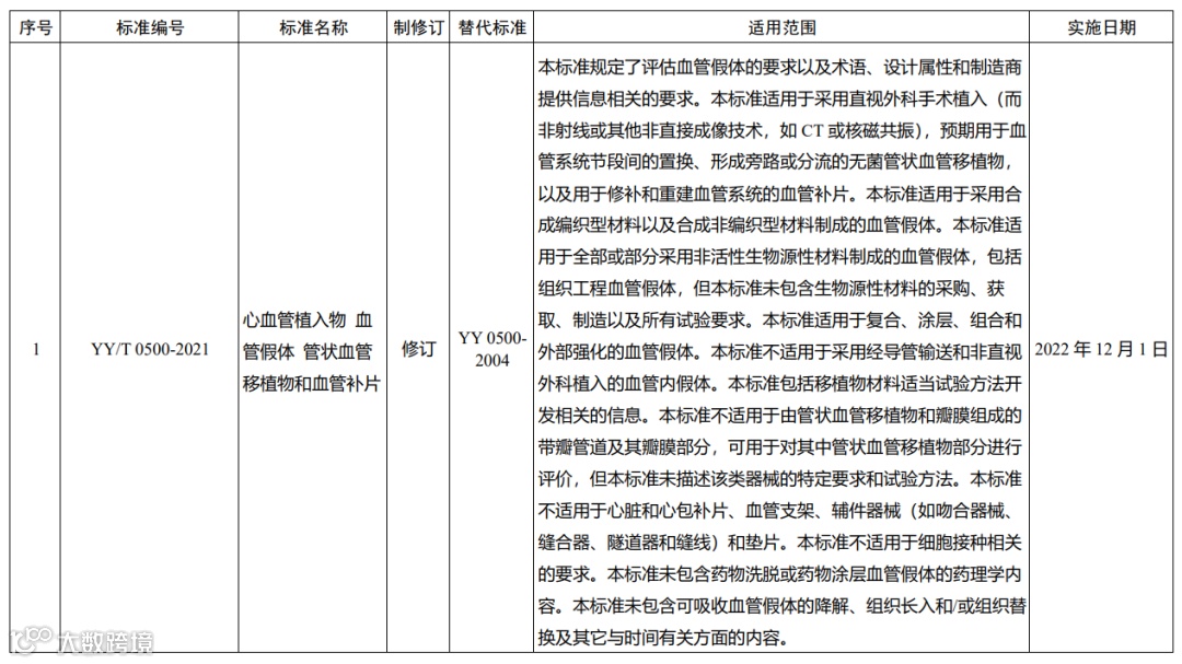 YY/T 0500-2021《心血管植入物 血管假体 管状血管移植物和血管补片》等19项医疗器械行业标准已经审定通过,现予以公布。标准编号、名称、适用范围和实施日期见附件。