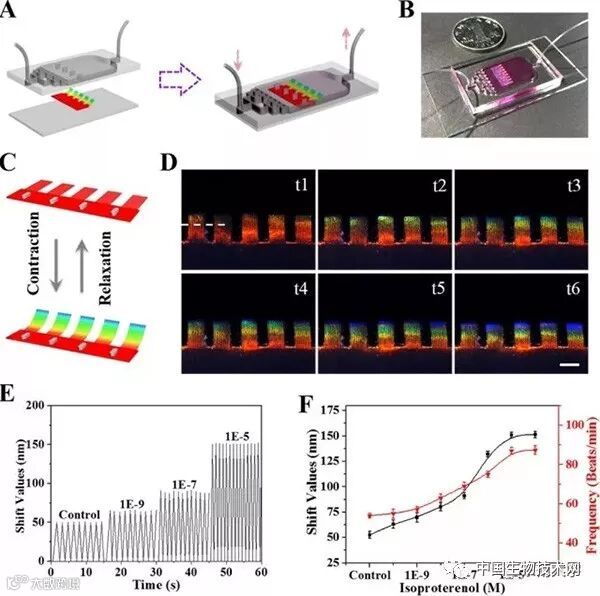 他们通过将心肌细胞培养在对光有反射作用、从而能产生颜色的反蛋白石结构水凝胶弹性薄膜中,形成一组“活体”结构色水凝胶材料,并集成到微流控芯片中。随着心肌细胞的搏动,薄膜相应伸长和收缩,从而反馈出光学信号,引起颜色变化。由此,一个前所未有的具有微生理可视化功能的“心脏芯片”得以开发。