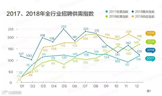 北森一体化人才管理云平台数据(以下简称“北森数据”)显示:对于整体的人才市场来说,2017年供需指数峰值为138,最低值为22,而2018年供需指数峰值为169,最低值为23。
