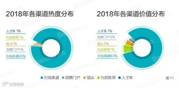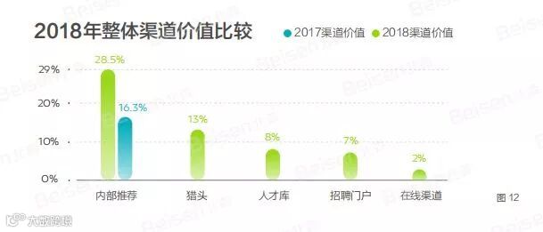 在各渠道价值比较中,高价值渠道的排序分别为内部推荐、猎头、招聘门户、人才库以及在线渠道。与2017年的数据进行对比发现,内部推荐价值显著增加,简历转化率从16.3%提升到了28.5%。