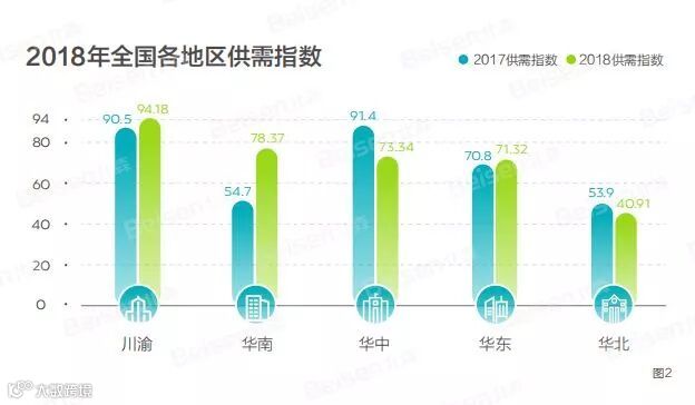 2017年供需指数趋势显示,新兴区域正在加速对人才的吸引,而2018年这种趋势依然在持续。川渝地区的供需指数跃升至全国首位94.18,由此可看出人才的流入更加明显。