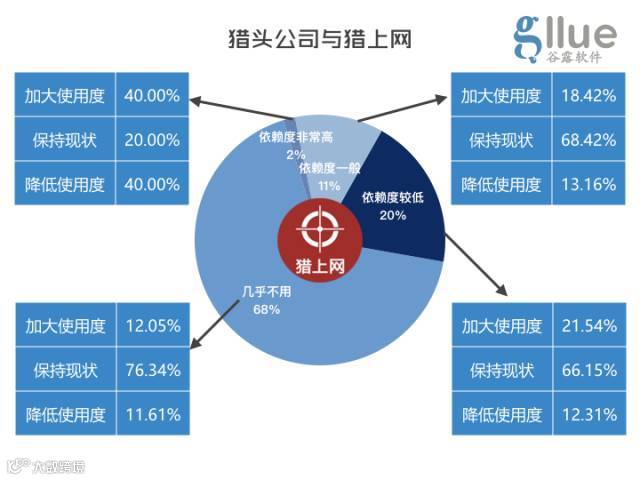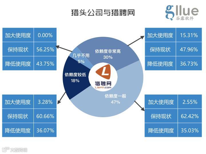 对于猎聘网的使用,目前有约3成公司极大依赖于此平台。猎聘的使用度较低的猎头将会持续或继续降低使用度,而目前高度依赖猎聘网的猎企也有36.73%会在未来降低使用度。