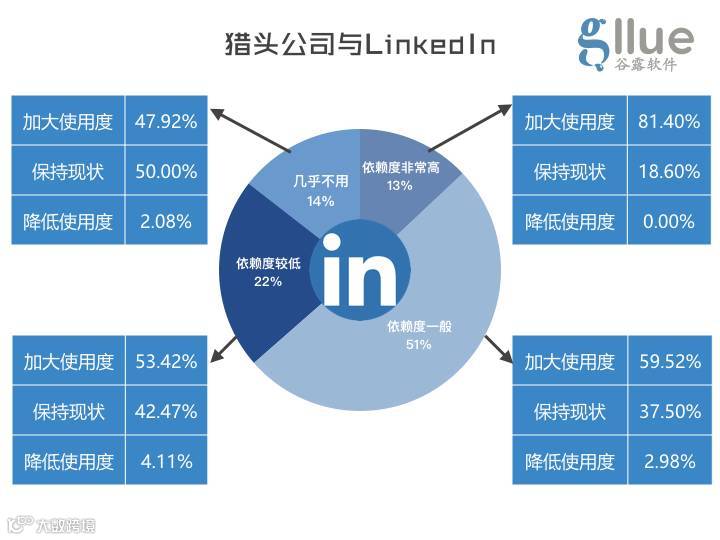 领英被越来越多人使用,使用门槛低和覆盖面广的特点,目前调研的公司中绝大多数表示将会增加对LinkedIn的使用。
