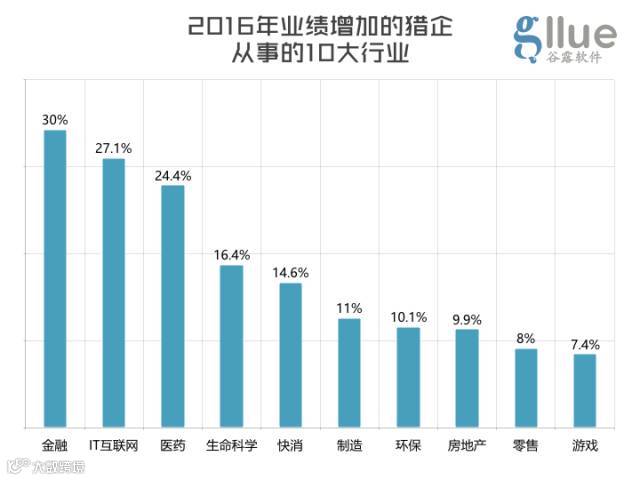 2016年预测业绩增加的猎头公司所从事的10大行业中,依旧是金融业和互联网行业领跑。