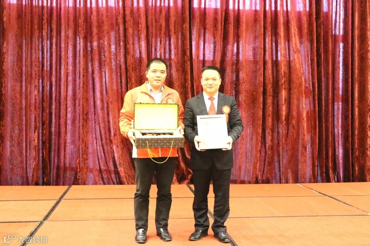 图为双方会长互相交换礼品,建立友好商会的牌匾赠送!