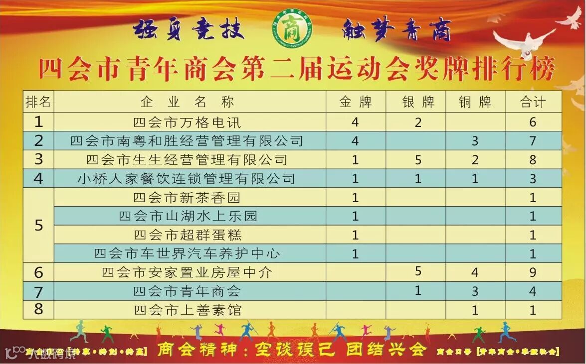 四会青年商会2015年5月31日—6月7日,四会市青年商会第二届运动会经过八天激烈和紧张的角逐,运动员本着“友谊第一,比赛第二”的原则,赛出水平,赛出成绩,以下是企业奖牌风云排行榜: