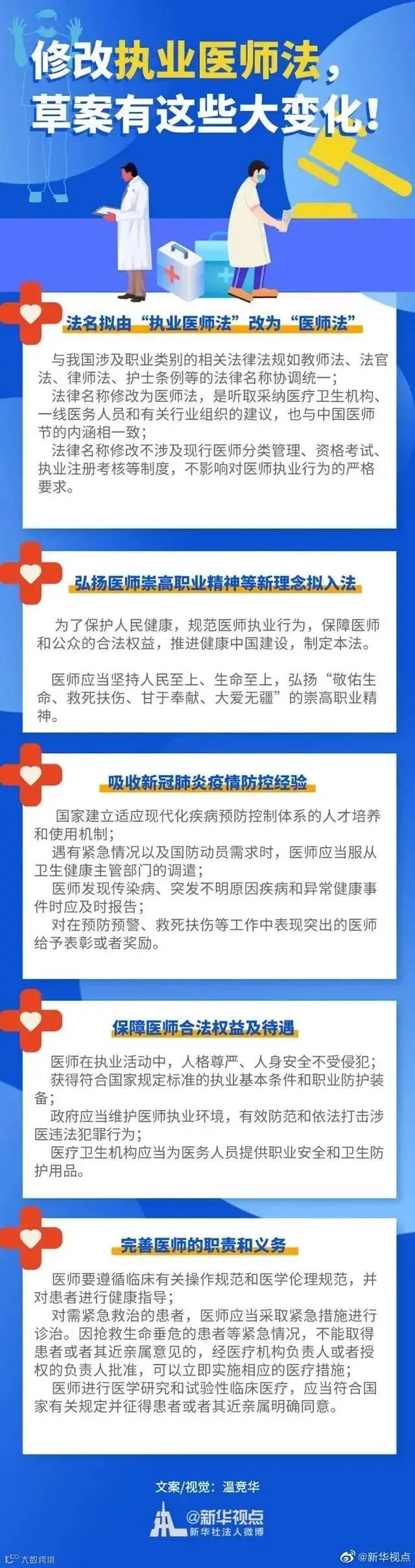 法律名称修改不涉及现行医师分类管理、资格考试、执业注册考核等制度,不影响对执业医生的严格要求。也预示着“医师法”将更加完善,法律法规的执行也将更加正规。