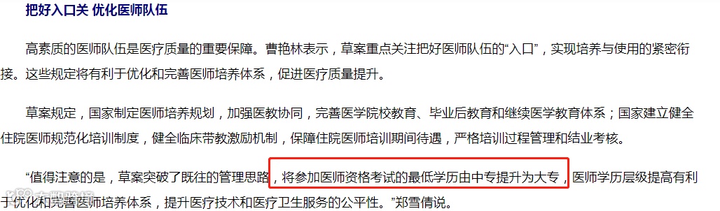 但按照修订后的草案来看,中专报考时代或将结束,大专成为最低报考门槛,参加医师资格考试的要求有了重大提升,对整个医师人才队伍将产生深远影响。