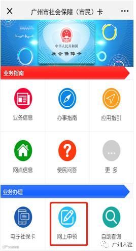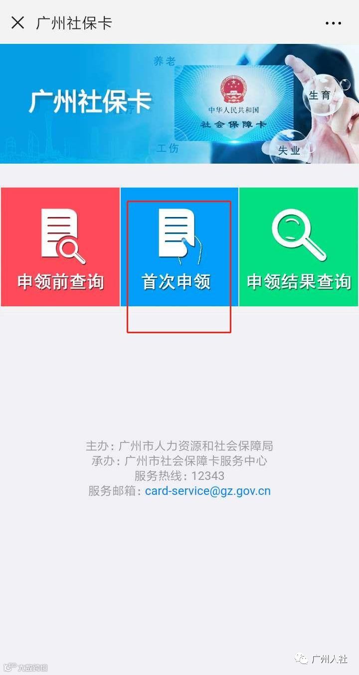 关注微信公众号“广州人社”,已办理居民身份证的中国大陆居民,可点击微信公众号 “社保通”栏目 →“社会保障卡”页面中→ “网上申领”→“ 首次申领”按钮申办。