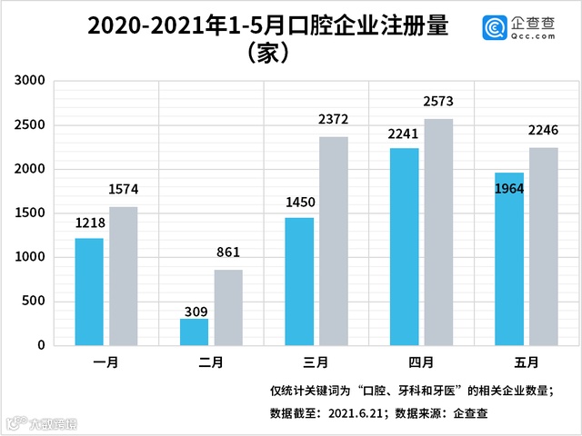 自2011年以来我国口腔相关企业的注册量逐年增长,2020年共注册2.25万家,同比增长6%;2021年1-5月共注册口腔相关企业9626家,同比增长34%。