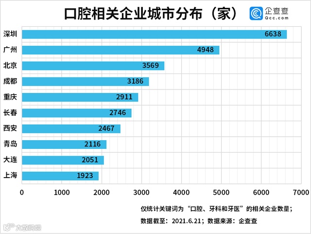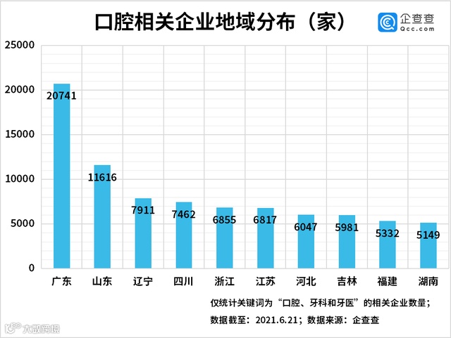 企查查数据显示,我国共有关键词为“口腔”、“牙科”和“牙医”的现存企业14.37万家(下称口腔相关企业),其中广东省以2.07万家摘得魁首,其次是山东、辽宁。