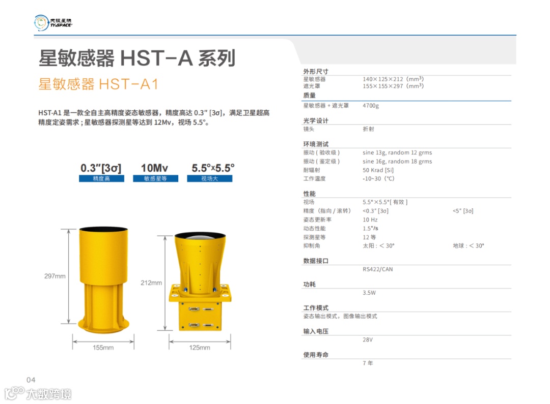 导读:HST-A1 是一款全自主高精度姿态敏感器,精度高达 0.3"[3σ],满足卫星超高精度定姿需求;星敏感器探测