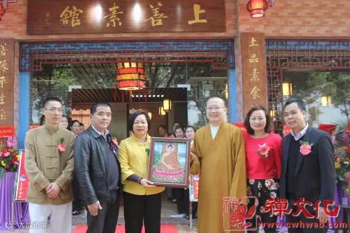开业这天,素食馆特意邀请了广东佛协副会长、四会六祖寺方丈大愿法师,北京社科院佛学研究员韩廷杰教授,广东中华文化促进会常务理事、广东古琴研究会会员、孔子七十四代传人孔浩泉先生,四会市日月星商行老总黄文生先生、金元印刷公司董事长周建生先生、文宝斋翡翠博物馆馆长廖锦文先生以及四会青商会各位理事、会员,四会慧海学佛小组以及各方朋友们前来,为上善素馆祝贺并敬献花蓝。