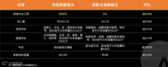 同时,装配式装修与传统装修相比,对节能减排有更大的贡献。从工期、用工量、用材量都有很大降幅。对于应对当下和未来建筑垃圾减量化的政策趋势,装配式装修的优势突出。