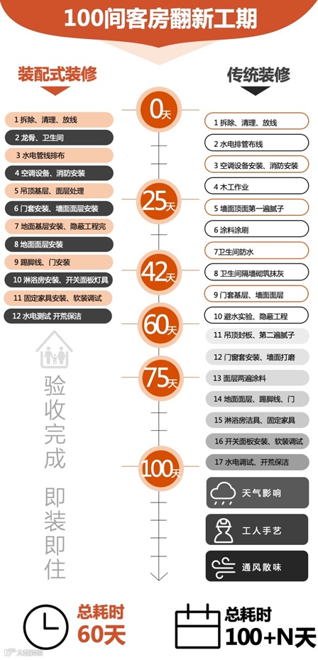 我们以一间有100间客房的经济型酒店翻新改造项目为例,比较一下装配式装修和传统装修的工期差异。