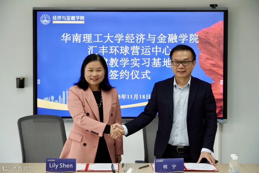 汇丰环球营运中心(中国)总经理Lily Shen与华南理工大学经济与金融学院行政副院长柯宁共同签署实习合作协议