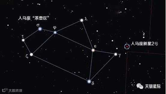人马座V6595(人马座新星2号)位于人马座“茶壶嘴”3等星γ星西北方距离1.75°的位置