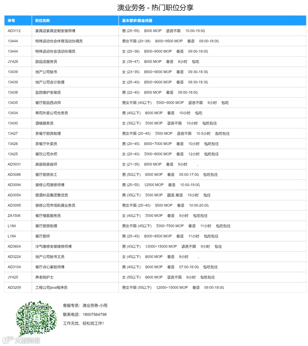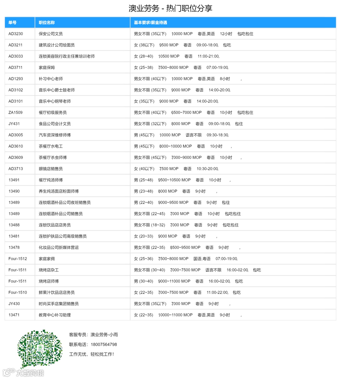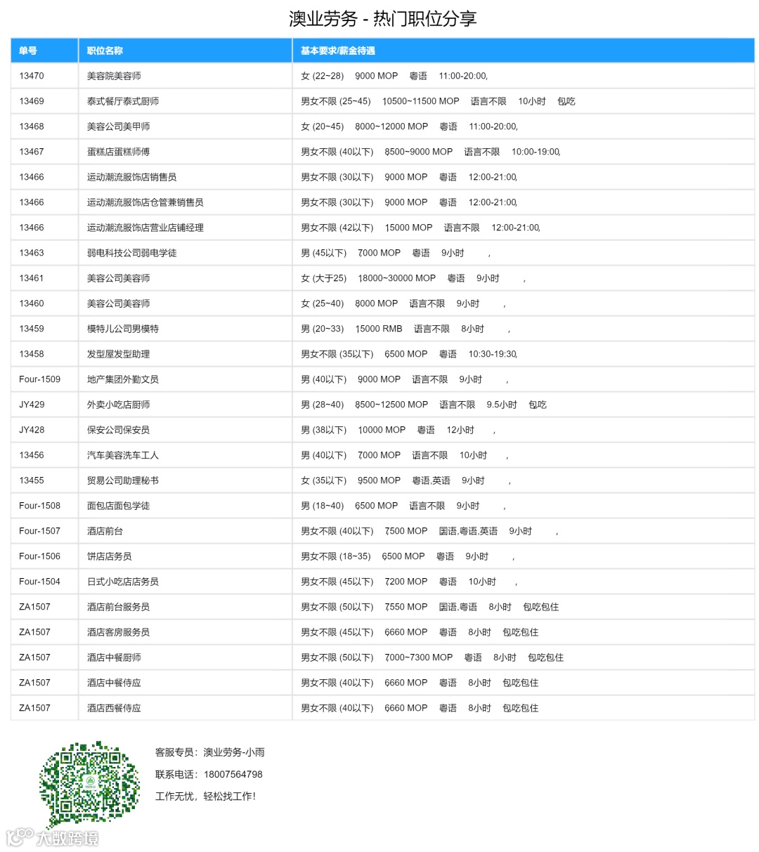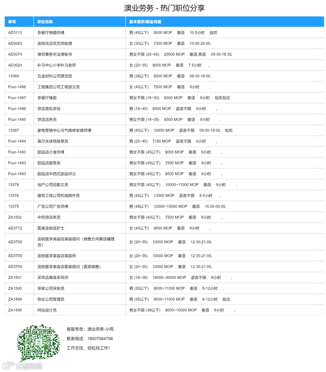 工作要求:1.五官端正,不抽烟喝酒,没有纹身,身体健康,能吃苦耐劳, 2.有礼貌,应变能力强,如有客户服务经验或前台经验优先考虑, 3.待遇MOP6656/月,加班工资另计,连加班费薪金9000-11000左右/月+包住,4.根据澳门政府劳工假期,以上内容仅供参考,具体信息以面试为准