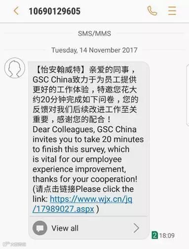 你会收到来自10690数字开头的手机短信,按入里面的调查链接,输入你的员工号,即可参加。