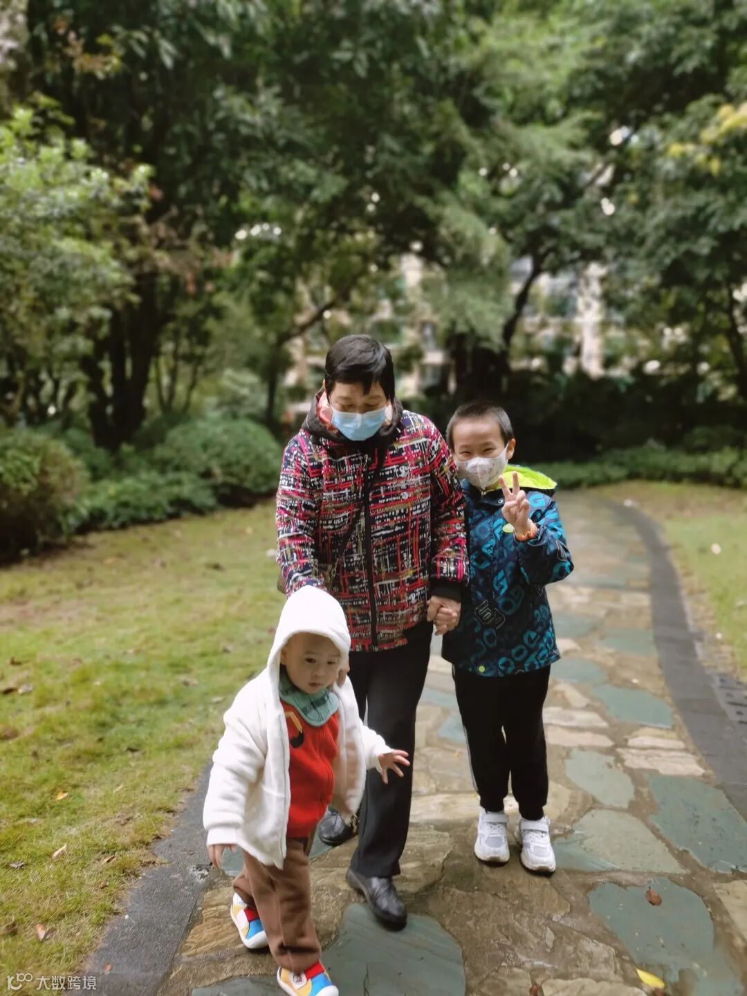 那一天又湿又冷,年迈的妈妈带着两个宝宝在湿滑的花园小路上散步,一路保护着宝宝不摔倒,眼神没离开过宝宝。我的眼也湿了,我觉得妈妈的世界很大,心里装得下很多很多人,妈妈的世界也很小,眼里只有爱的人……