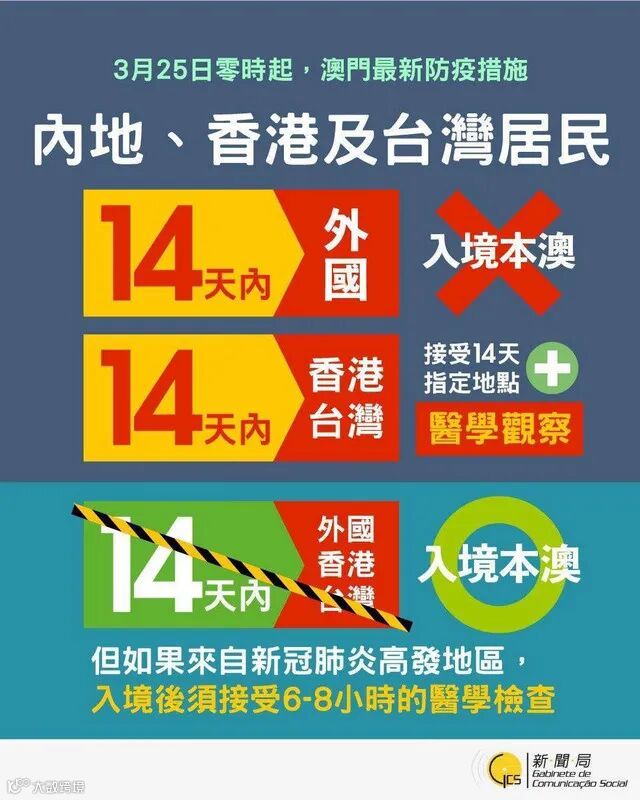 明日凌晨起,所有在14天内曾到过香港、台湾的入境人士需在卫生当局指定地点医学观察14天。贺一诚表示,若内地居民在入境澳门前14日曾到外国、港台,亦需在指定地点医学观察14日;反之,入境澳门前14日没有到外国、港台的内地居民(除湖北省),则与现时一样,可以入境,但若曾到高发地区需接受医学检查。