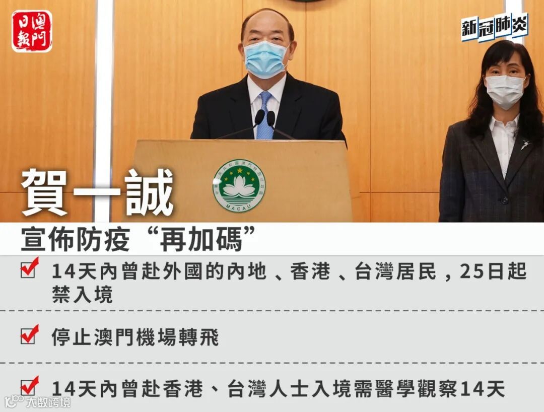 澳门特区行政长官贺一诚今日宣布,根据香港特区新措施,澳门特区政府将作相应措施配合,今日颁布批示,明日(25日)凌晨开始,禁止所有入境前14天内曾到外国的内地、香港、台湾居民入境澳门,停止澳门机场的转飞服务。