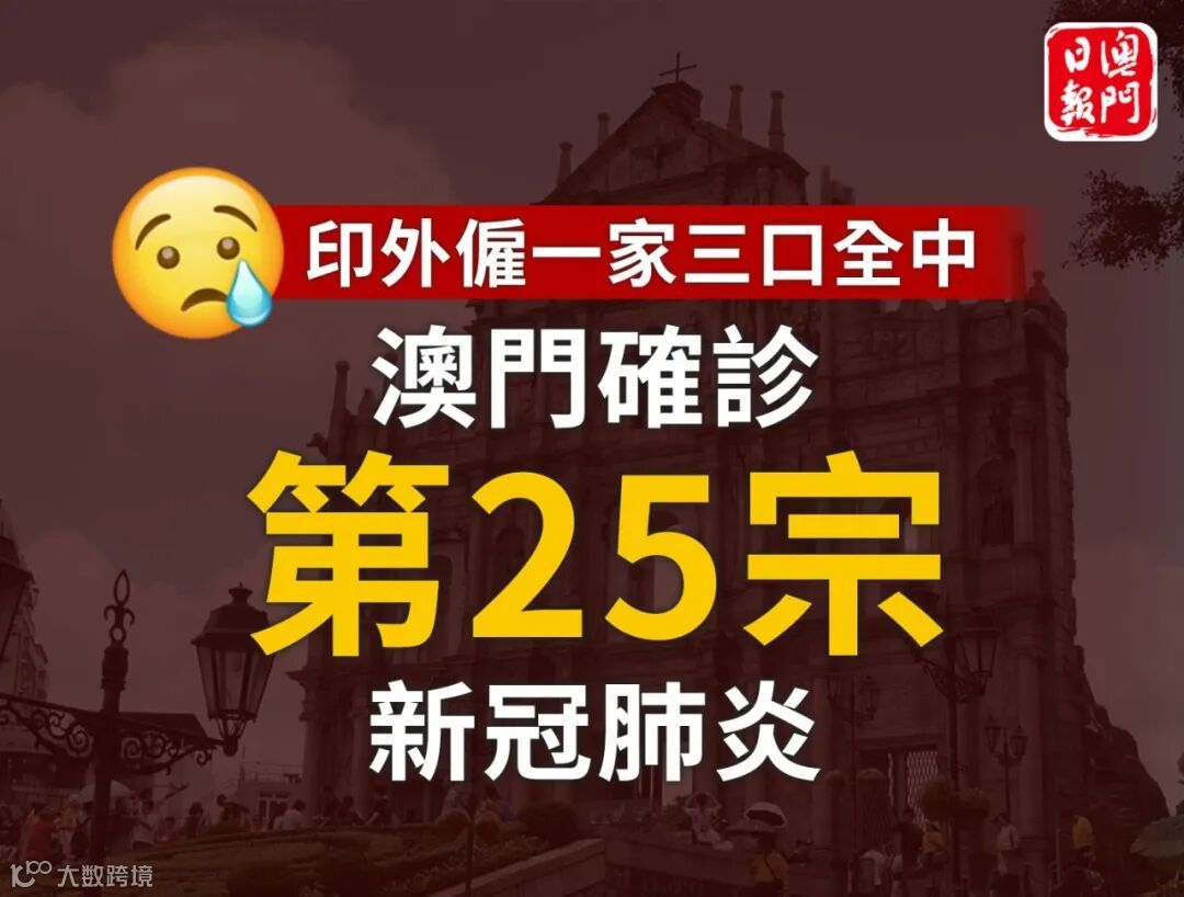 新型冠状病毒应变协调中心表示,昨日新增一例新型冠状病毒肺炎输入确诊病例,为本澳第25例。印尼外雇一家三口确诊染疫。