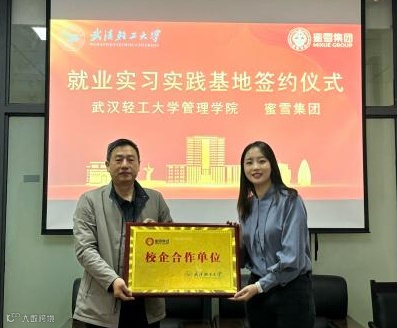 武汉轻工大学管理学院党委书记房桂兵与蜜雪集团人才供应部负责人吴菲菲互授校企合作牌匾,标志着双方正式建立起紧密的合作关系。