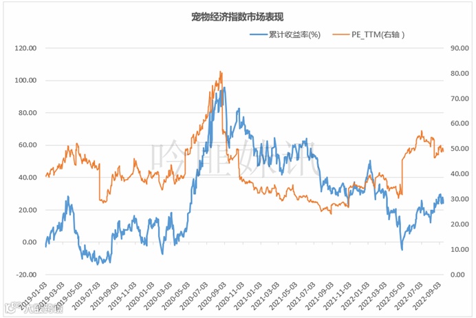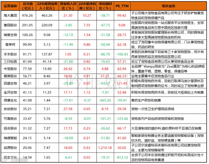 根据wind数据,宠物经济概念指数经历了2020年9月的上涨后一直处于回调期,2022年4月底以来处于筑底回升的阶段。从指数当前的估值来看,当前宠物经济指数的市盈率处于2019年以来的中高位,宠物经济相关概念股如表所示。