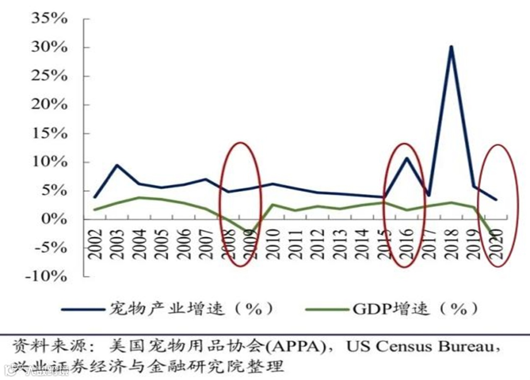 从其他成熟市场的发展历程看,宠物经济具有逆经济周期性,美国近十年有两次很大的经济萧条,08年的金融危机和16年的GDP下滑,宠物经济的增速却在这个时期不降反增。即便是受疫情影响,20年美国的GDP增速是负值,不管是服务业还是零售业都大幅衰退,但宠物经济的增速为5%。