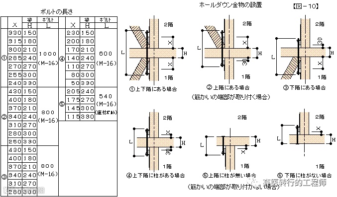 接合金物中で、ホールダウン金物が、筋かいにあたって筋かいを欠損させたり正しく施工されていない場合が多いので【図-10】に設置の対応を掲載いたします。