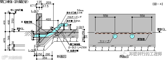 また 基礎を貫通する設備配管のためのスリーブ管も基礎の弱点となりますので補強が必要です。