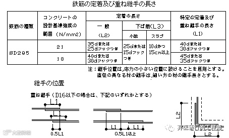 また、配筋の途中で鉄筋の継手を設ける場合は、重ね継手(※1)とし、継手位置は、応力の小さい位置(支点間の1/4) 及び 隣り合う継手が同じ位置に重ならないように重ね長さの1/2以上離れた位置で継ぎ手を設けることが望ましい。