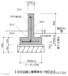 ※布基礎の各部の寸法は、基礎の立ち上がりをGL+400mm以上とし、底盤の寸法は、地盤の地耐力等を考慮して巾を広げて対応する。