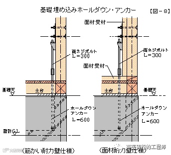 また 阪神・淡路大震災以後、平成12年の建築基準法の改正により、基礎に埋め込むホールダウン・アンカーボルト(埋め込みホールダウン金物)【図-8】が必ず必要になりました。