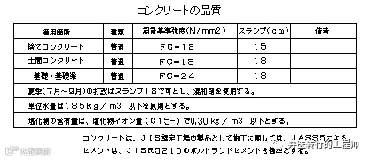 基礎に使用されるコンクリートは、JIS A 5380(レディーミクストコンクリート)に規定されたポルトランドセメントとし、JIS認定工場(生コンクリートプラント工場)で製造された生コンクリート、設計強度は24N/mm2以上とする。コンクリート打設時の気温が2℃~10℃未満の場合は27N/mm2にコンクリート強度の補正を行なう。