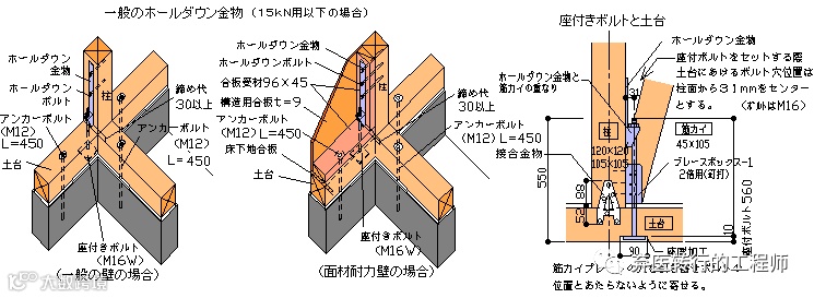 ※耐力壁による柱に必要な接合金物にホールダウン金物が必要な場合に、15kN用以上は土台が引張力に耐えられないので、基礎に埋め込んでホールダウン金物(ホールダウン・アンカー)を設けるようになります。