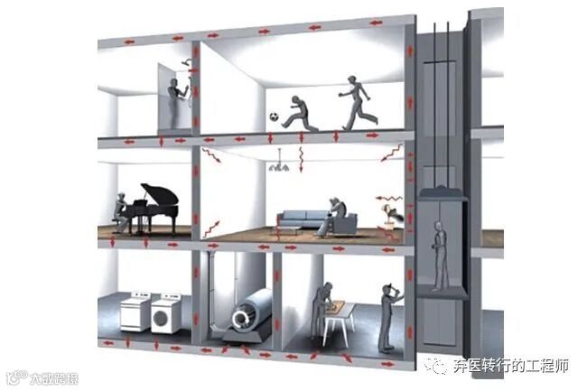 80%的邻里噪音是“摩擦、撞击”楼板/墙体引起的“能量传递”,通过楼板、墙体、梁柱等建筑主体结构传入家中并发出响声。就是我们常说的“结构传音”“固体传声”“共振”“震动噪音”,固体传音会导致部分楼下发生的噪音会让住户感觉到是从楼上传来的。在民用建筑建设中楼板进行隔声处理,最常见的措施包括设保温层或设减震垫。
