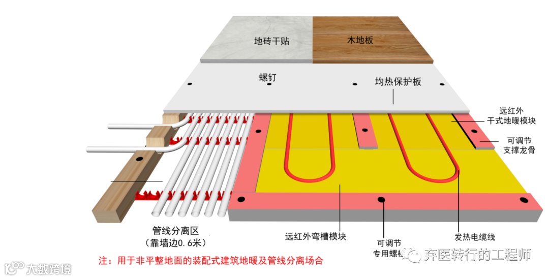 真正要对楼板隔音,就要引入减振工艺,装配式多功能地暖是采用铝板干式地暖、调平龙骨和均热保护板等新材料架空铺设,不需要水泥回填和湿法地面找平,具有地面保温、防潮、减震、隔音等多项功能的高效薄型地暖。表面直接铺地板或地砖,总成厚度4.8CM、铝板厚度0.25mm,地暖模块抗压强度250KPa,调平龙骨和均热保护板为干法找平地面系统,采用无机防火玻镁板等材料制作,分为左右架空型和上下架空型两种做法。广泛应用于装配式建筑、家装高端地暖、架空地面及不用水泥找平的快装地暖等场合。