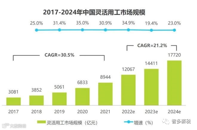 灵活用工市场规模高速增长的两大推动力:一是平台经济、共享经济蓬勃发展;二是疫情冲击和经济环境的剧烈变化。