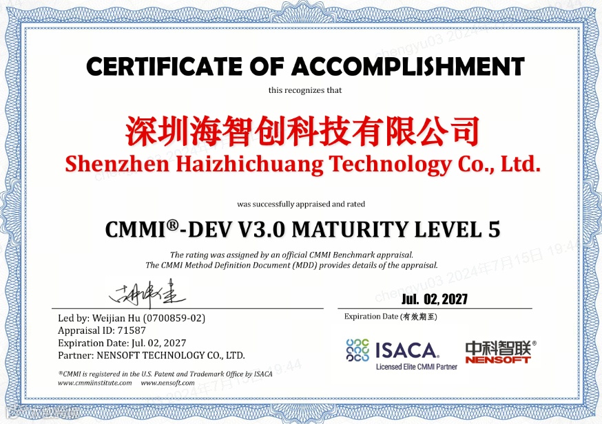 为确保软件项目“建一成一”,中海科技全面推进软件研发能力的建设并取得了业界的高度认可。近日顺利通过了软件领域国际最高级别CMMI5认证,标志着中海科技在技术研发、服务交付、项目管理等方面接轨国际最新标准、达到国际一流水平,能够为客户提供高质量的服务、更好满足客户需求。
