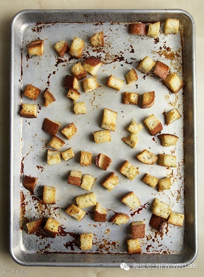 将调了味的面包丁倒入烤盘,再放入204.5℃的烤炉中烘焙约15分钟或者烘焙至酥脆。烘焙中途要抖动烤盘让面包丁均匀烘焙。