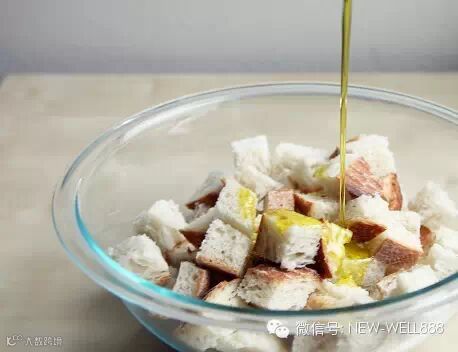 将面包丁倒入搅拌盘,加入橄榄油并拌匀,每两片面包片搭配1汤匙橄榄油。再加入粗盐调味,可以按照个人喜好,再加入新鲜的或者晒干的香草调味并拌匀。对于晒干的香草来说,添加的份量应该是每两片面包搭配1/4茶匙香草。对于新鲜的香草来说,添加的份量应该是每两片面包搭配1/2茶匙香草。