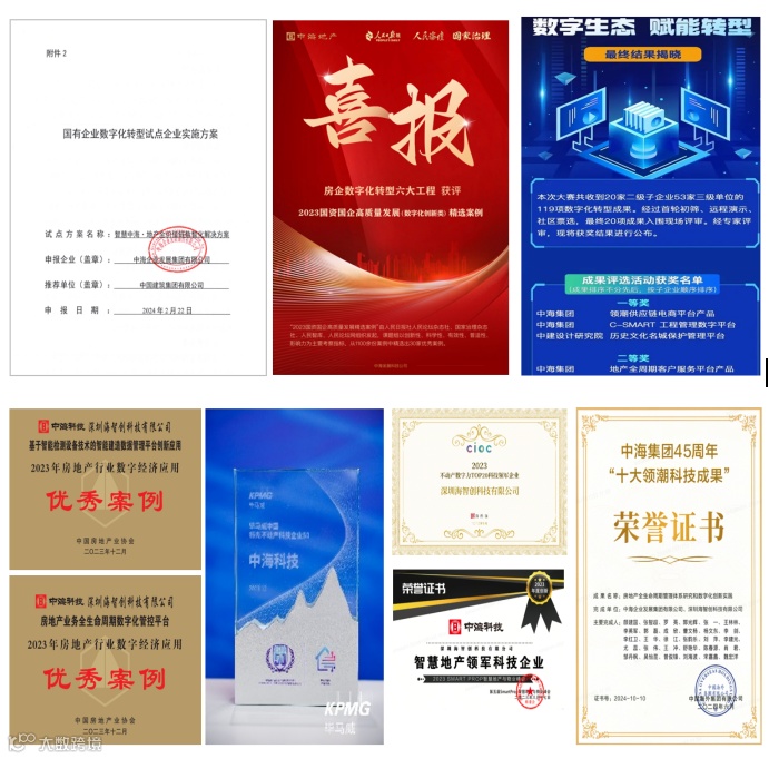 中海地产数字化转型整体解决方案经过验证打磨,获得社会各界的高度认可:中海地产成为“国资委国企数字化转型试点企业”;数字化转型相关案例获得中海集团45周年“十大领潮科技成果”、中建集团2024年度数字化转型成果大奖、人民日报“国资国企高质量发展精选案例”、中国房协“2023年房地产行业数字经济应用优秀案例”。作为项目的实施主体,中海科技也得到了社会各界众多高度评价,荣获毕马威、克尔瑞、观点地产等数字化转型多项大奖。