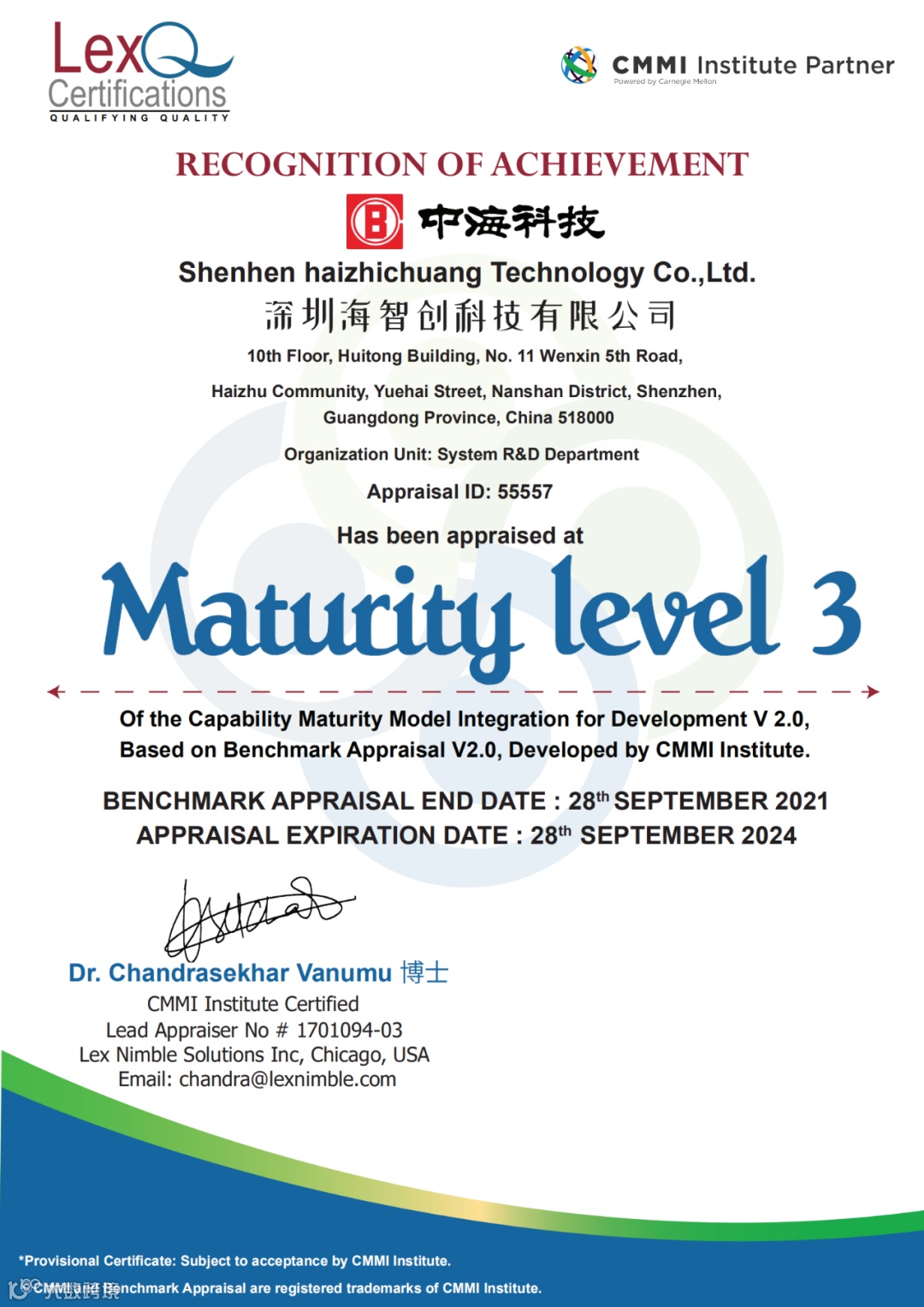 自2020年3月成立以来,深圳海智创科技有限公司(下称“中海科技”)始终坚持对标行业优秀企业的专业化管理做法、对齐国际通用的软件开发标准开展各项工作,专业化管理水平与研发能力不断提升。近期,在经历长达1周的海外视频评审后,中海科技成功取得CMMI3资质认证。