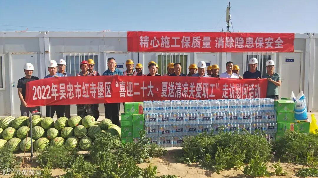 7月6日,红寺堡区政协主席张致强、工会常务副主席马军一行莅临晓鸣股份红寺堡智慧农业产业园项目基地,慰问在高温下奋战一线的施工人员,并送来了西瓜、矿泉水、绿茶、冰糖、茶叶、羊肉等防暑慰问物资。慰问组一行向在高温天气下坚守在岗的户外劳动者表达了诚挚的感谢和亲切的关怀;同时嘱咐广大户外劳动者在履行好本职工作的同时,一定要注意自身安全,平安度夏。
