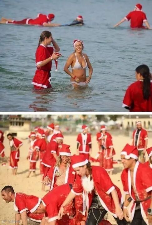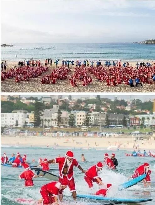 几日前,悉尼Bondi海滩上十分热闹~不过海滩上可不是身着比基尼的辣妹或是穿沙滩裤的帅哥哦,而是320名身穿圣诞老人服饰的当地人~